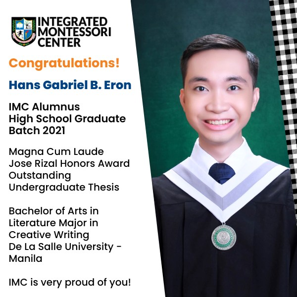 We are very proud to congratulate Hans Gabriel B. Eron! Hans graduated Magna Cum Laude from the De La Salle University - Manila with a degree in Bachelor of Arts in Literature Major in Creative Writing. He was also awarded the Jose Rizal Honors Awards and Outstanding Undergraduate Thesis. Hans belongs to IMC High School Batch of 2021. He graduated with High Honors and took up HUMSS for his Senior High School track. He was a writer for the Intrepid Pen and subsequently won 4th Place in the Column Writing Category for Division Schools Press Conference Qualifiers in 2019.