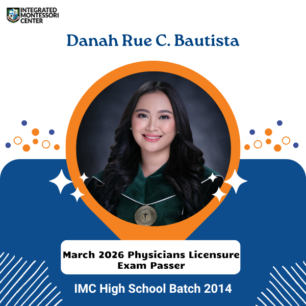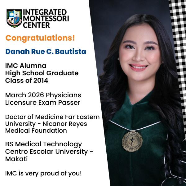 We are very proud to congratulate our very own alumna Danah Rue C. Bautista for passing the March 2026 Physician Licensure Exam. Danah pursued her Doctor of Medicine at Far Eastern University - Nicanor Reyes Medical Foundation. She completed her Bachelor of Science in Medical Technology from Centro Escolar University – Makati. From preschool to high school, Danah completed her education at IMC, graduating with the Batch of 2014. She was a Loyalty Awardee at graduation and a consistent Merit Awardee during her time at IMC. Academics aside, Danah was the IMC Music Ensemble President, a member of the IMC Fine Arts Society and IMC Volleyball Varsity. Danah dedicated herself to academics and her interests in pursuit of excellence. She personifies the qualities of an IMC student at their finest.