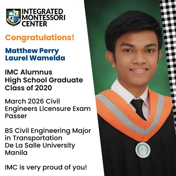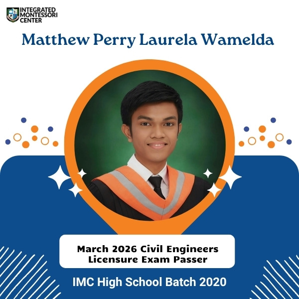 IMC is very proud to recognize and congratulate Matthew Perry Laurel Wamelda who passed the March 2026 Civil Engineers Licensure Exam. Matthew was a consistent Dean’s Lister at De La Salle University – Manila, where he took up Bachelor of Science in Civil Engineering Major in Transportation. It is worthy to note that Matthew, a loyal IMC student since preschool, was a consistent MTAP winner and Honor Student during his high school years in IMC, amongst other academic pursuits. We take great pride in having been part of your academic journey and in witnessing the success you’ve achieved today.