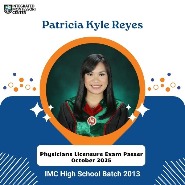 IMC proudly congratulates Patricia Kyle Reyes who passed the October 2025 Physicians Licensure Exam! Patricia completed her Doctor of Medicine at Metropolitan Medical Center – College of Arts, Science and Technology. Prior to this, she graduated Bachelor of Science in Biology from the University of Santo Tomas. Patricia began her studies in elementary at IMC and continued to high school where she graduated with IMC High School Batch of 2013. A consistent merit awardee throughout high school, her studies did not deter her from joining different organizations such as the dance troupe, singing in programs and joining the choir. She was also active in the arts, where she was one of the cast members of CATS, in the earlier years of IMC holding stage performances at the AFP theater.